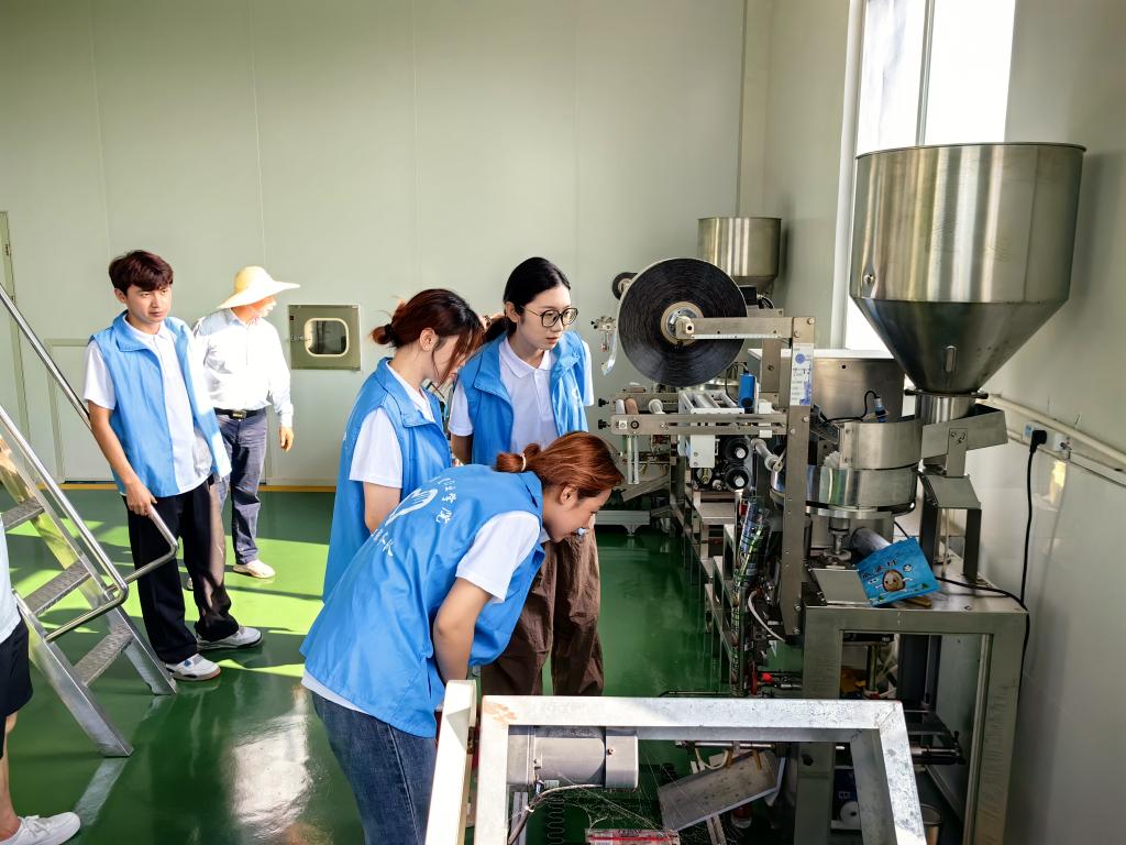 在瓜蒌种植基地,团队成员冒着酷暑帮助当地种植户为瓜蒌进行扶蔓;在瓜蒌研发加工基地,跟随工作人员在车间分工协作学习配料、烘炒、包装;在瓜蒌电商销售基地,积极主动利用所学专业知识开展直播助农活动。
