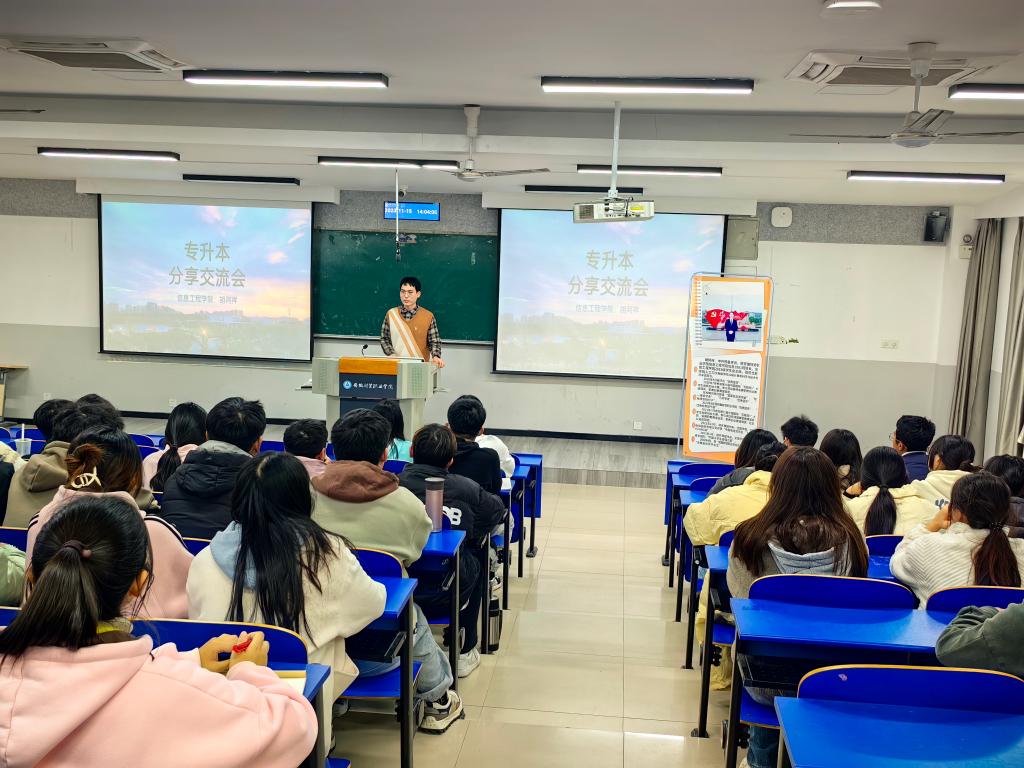 近日,信息工程学院先后邀请了优秀毕业生胡阿祥和潘修山返校,开展“专升本主题”和“就业创业主题”分享交流会,分享会吸引了300多名同学参加。