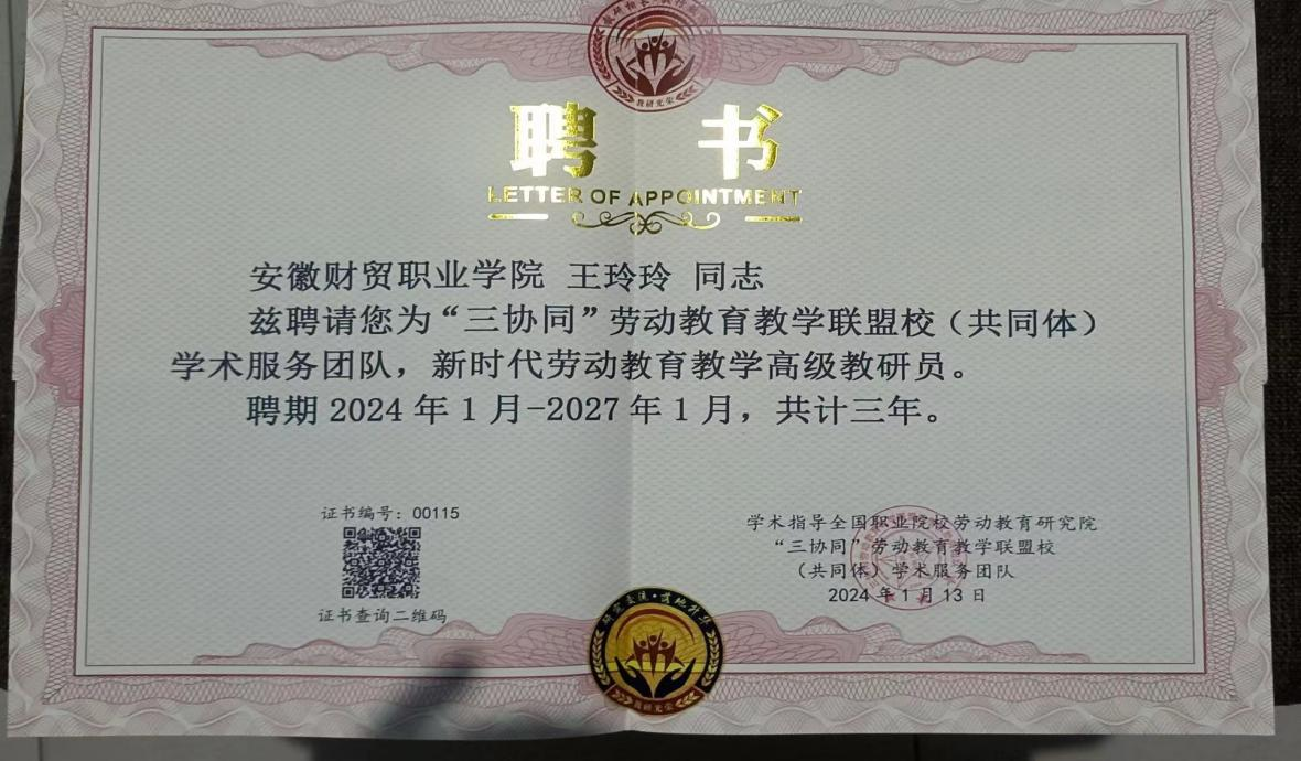 1月12日至15日,《数字赋能成果育人新时代劳动教育实施与品牌建设之名师工作室阶段性成果展示培育推荐高级研修班》暨“巾帼励志杯”新时代劳动教育阶段性成果公益展示活动在海南召开。本次研讨会由教育部职业院校文化素质教育指导委员会劳动教育专委会、全国职业院校劳动教育研究院、中国管理科学研究院教育创新研究所指导,北京新职业技能培训产业联盟主办,安徽财贸职业学院等高校协办,马克思主义学院《劳动教育》教师韦瑶参加线上会议。