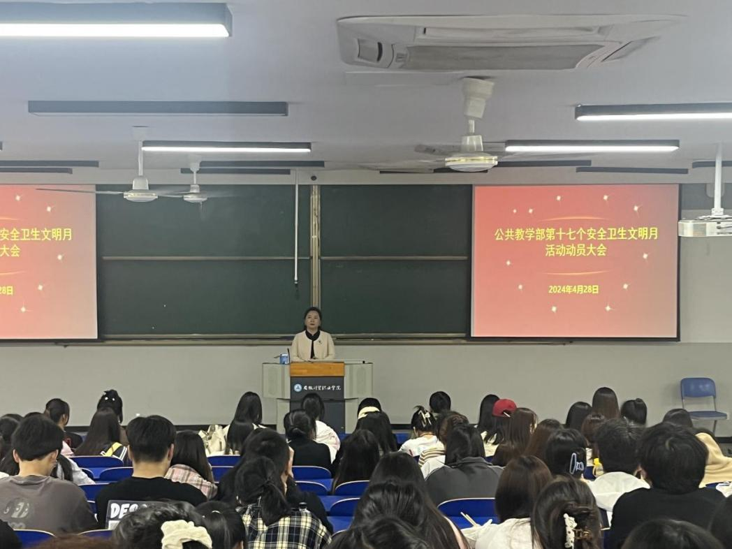 4月28日中午,公共教学部组织召开第十七个安全卫生文明月动员会。全体在校班级专兼职辅导员、寝室长、班长及团学干部参加活动,党总支副书记宋凌云出席活动并做动员讲话。