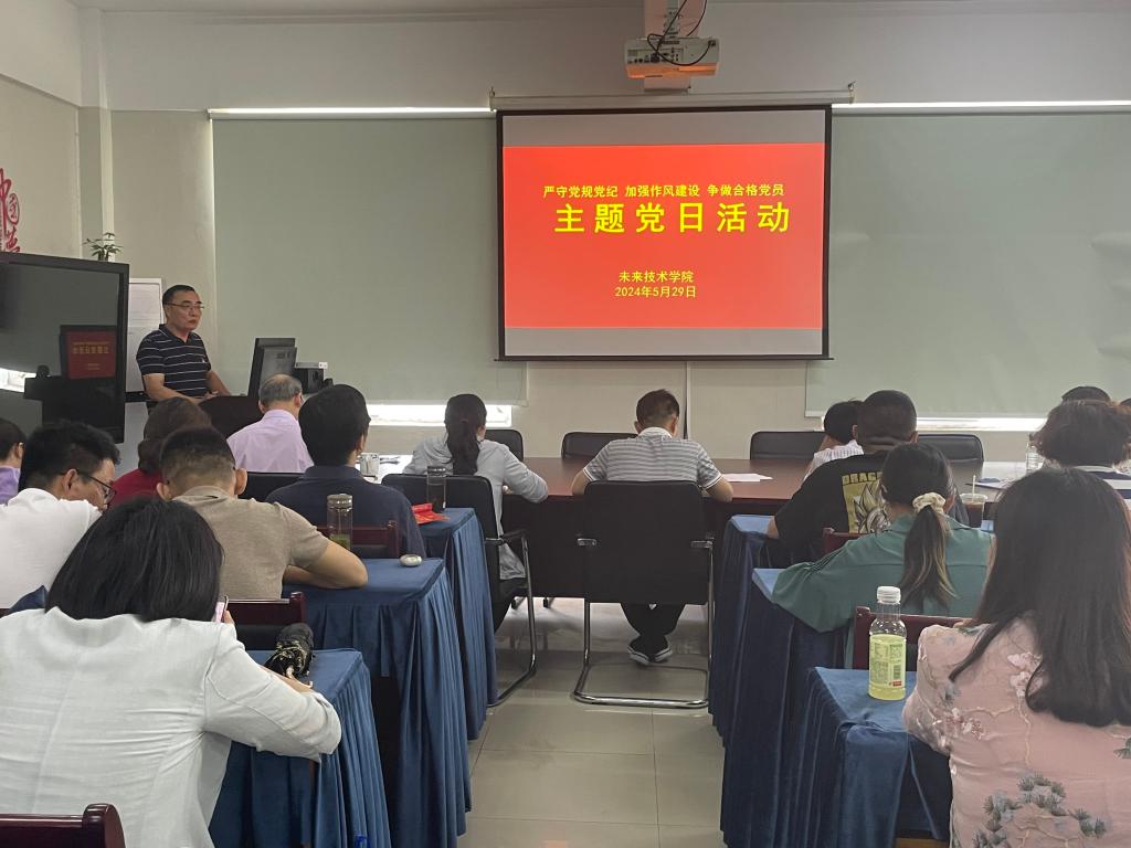 5月29日下午,未来技术学院党总支开展“严守党规党纪 加强作风建设 争做合格党员”主题党日活动。党总支书记刘葆围绕学习贯彻《中国共产党纪律处分条例》(以下简称《条例》),以《做学纪 知纪 明纪 守纪的模范》为题向全体党员讲授专题党课,推动党纪学习教育入脑入心。