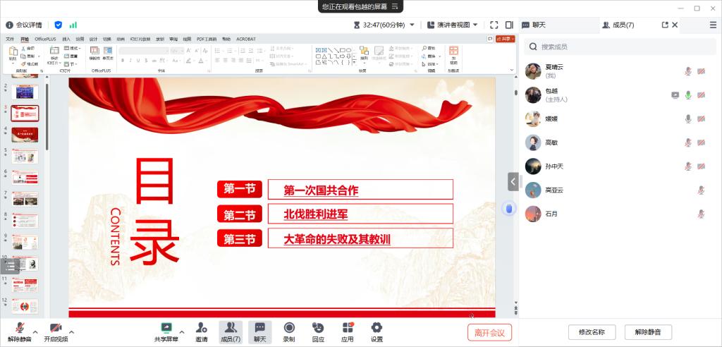 包越老师就开天辟地的大事变和“轰轰烈烈的大革命”中的主要知识点和难点进行了讲解,并提出了本课程实训活动方案。与会教师围绕本次会议主题,提出自己的见解和问题,进行了热烈而深入的讨论。大家从不同层面解读历史事件,挖掘其中蕴含的思想教育资源,共同探讨如何将理论知识生动形象地传授给学生,让党史国史教育更加鲜活有力。(供稿:包越 审稿:张少兵)