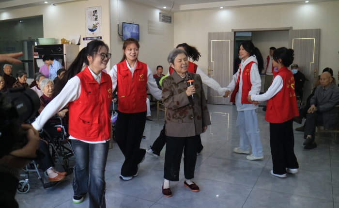 此次“尊老、敬老、爱老”志愿服务活动中,台上的志愿者载歌载舞、热情洋溢,台下的老人看得津津有味,掌声、笑声不断。此时此刻,两代人幸福的模样被具象化了。(供稿:沈丽萍 审稿:左艳琼)