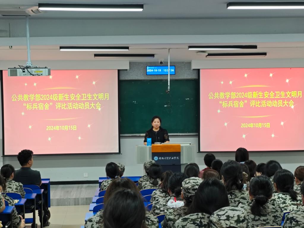 10月15日中午,公共教学部组织召开2024级新生安全文明卫生月活动动员会。全体在校班级专兼职辅导员、寝室长、班长及团学干部参加,党总支副书记宋凌云出席活动并作动员讲话。