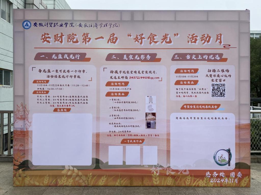 近日,总务处开展“诚信尚俭、共享食安”学生食堂第一届“好食光”系列活动,旨在持续提升全校师生“吃在食堂、乐在安财院”的满意度,营造“人人参与、安全共治”的良好风尚。