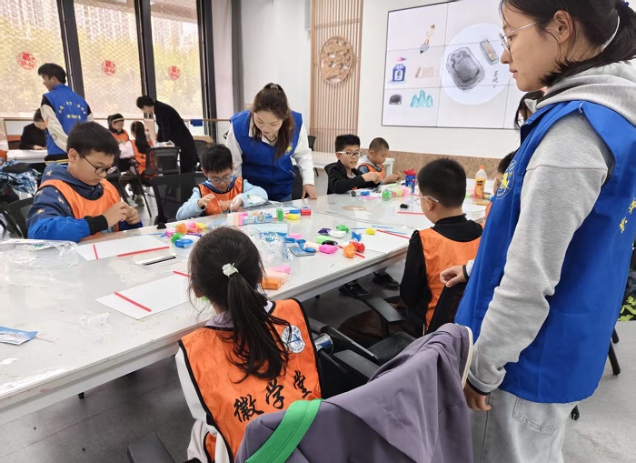活动当天,志愿者们早早来到安徽博物馆入口处,负责签到工作并维护现场秩序,引导小朋友们有序列队入场。在课堂区域,志愿者积极协助老师,完成任务分配、辅助教学与分组指导等工作。他们时刻留意孩子们的状态,耐心辅助小朋友完成课程内容。在黏土手工环节,志愿者与小朋友携手创作,在大手与小手的协作下,黏土化作一件件创意十足的作品。