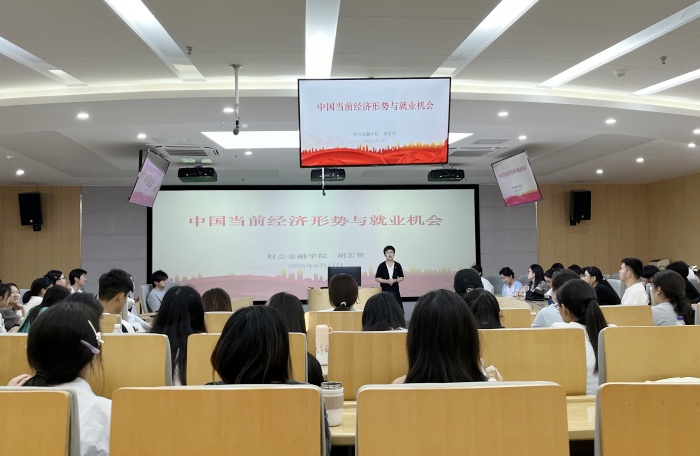 胡宏萱以《中国当前经济形势与就业机会》为题,以中国经济“发展信心从哪来”“迎难而上靠什么”“奋发有为怎么干”三问展现中国经济行稳致远。通过数据及现状分析,帮助同学们找准当下就业形势中的就业机会,并围绕学校保障机制及学生就业方向两个维度探索高质量充分就业新路径,引导广大青年学生树立正确的就业观、择业观。