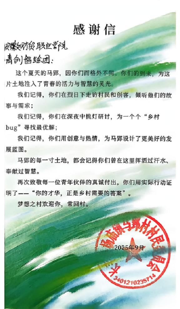 9月,财会金融学院收到长丰县杨庙镇马郢村的感谢信,信中感谢学院“青创智绘团”在大学生暑期“三下乡”社会实践活动中所作出的积极贡献。