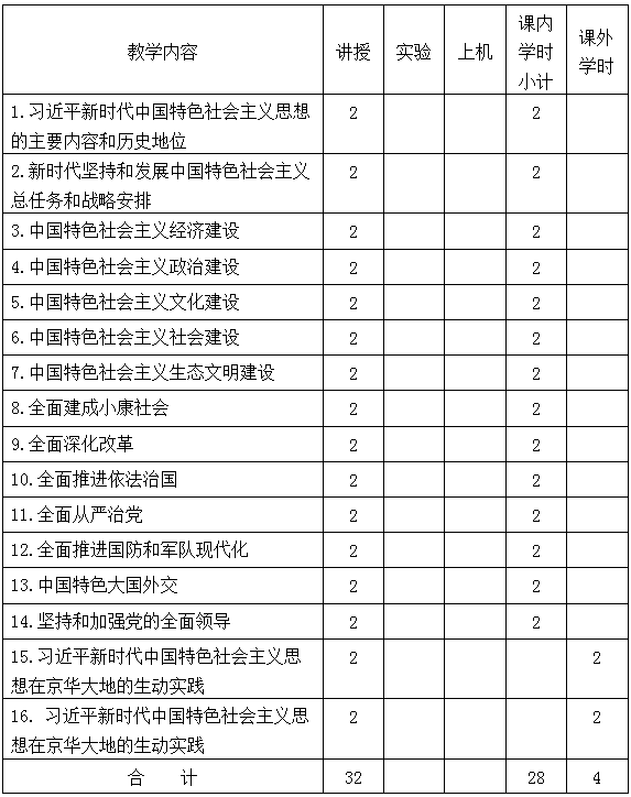 本课程教学共32学时,有4学时实践教学安排在讲授学时内。教学内容依托北京高校思政课高精尖创新中心首批12个“习近平新时代中国特色社会主义思想在京华大地的生动实践”教学案例,以及学校现有的思政课实践教学资源,选择2个案例,组织学生进行实践教学。