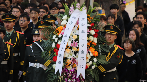 活动在高唱的国歌声中开始。伴着庄严肃穆的献花曲,学生代表向革命先辈敬献花篮,校党委副书记田红芳上前整理花篮缎带。