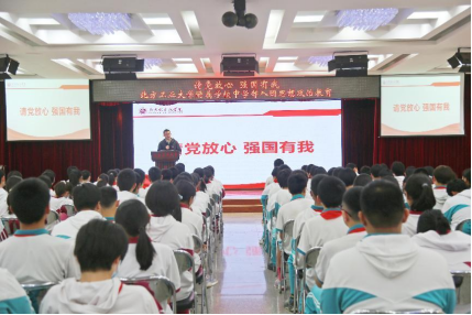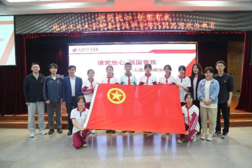 近日,谈球吧团委应邀到北方工业大学附属学校联合开展共青团五四青年节主题教育活动。学院团委书记闻亮带队,2022级研究生张华超、张震向附属学校八年级学生讲授了主题为“请党放心 强国有我”的团课。附属学校师生代表130余人参加活动。