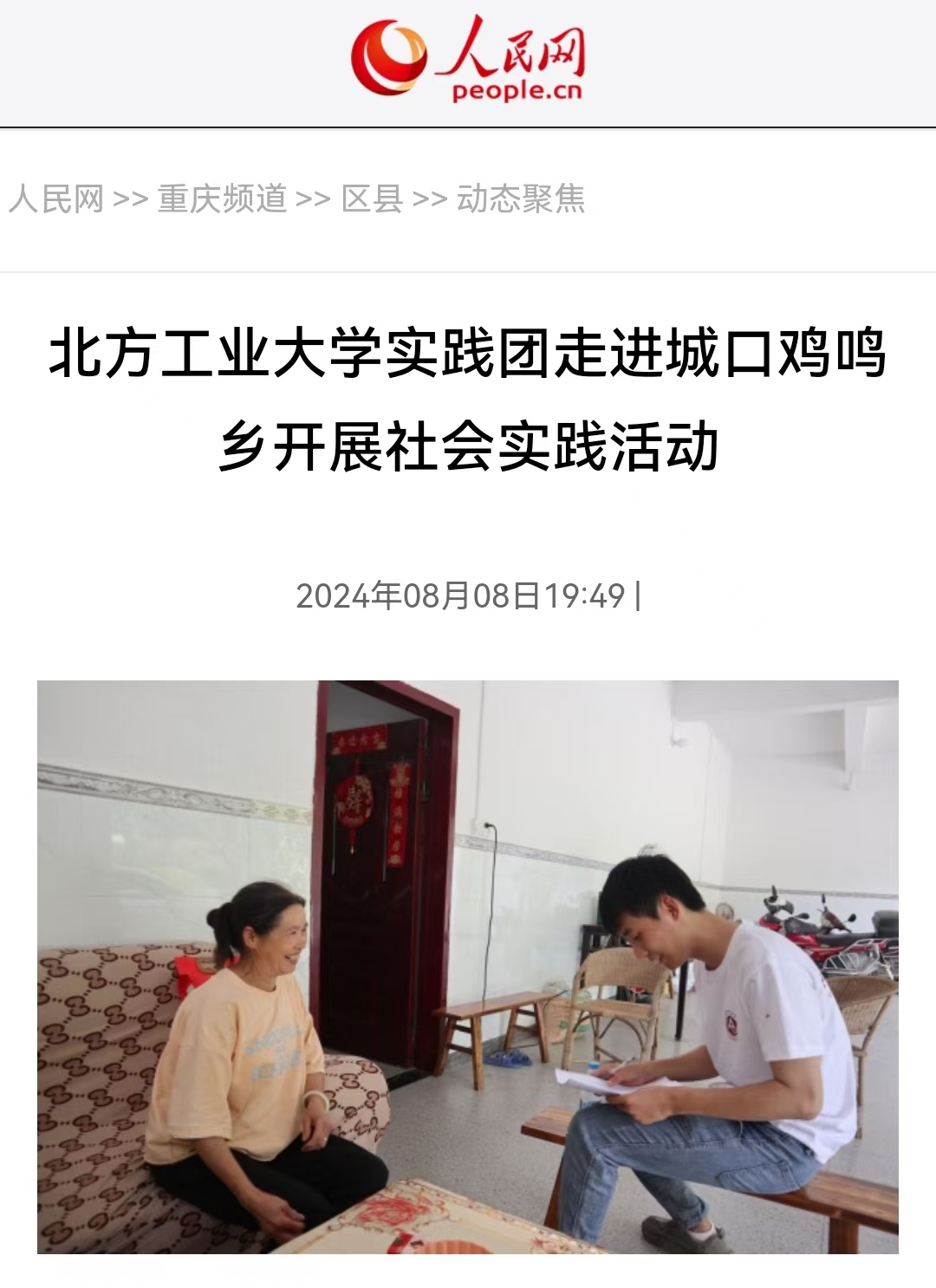 为深入学习贯彻习近平总书记关于“三农”工作的重要论述,以实干担当迎接和庆祝中华人民共和国成立75周年,近日,北方工业大学“‘乡’约城口,青年先行”实践团从北京跨越一千多公里来到重庆市城口县鸡鸣乡,聚焦产业振兴、文化振兴、生态振兴三大方面,联动政府、企业以及学校三者展开实践活动,受到人民网关注并报道。实践团的同学们深入乡村生活,感悟乡村发展,立足专业特长,以青年才智为全面推进乡村振兴蓄力赋能。