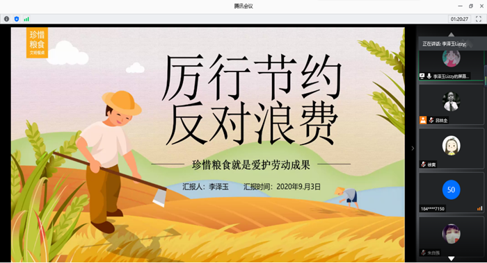 召开“厉行节约 反对浪费”线上会议。学校团委组织团学青年召开“厉行节约 反对浪费”线上学习交流会,向广大团学青年传达当前国际粮食安全和粮食危机形势,引导青年热议身边发生的浪费现象和节约典型,树立“节约光荣,浪费可耻”意识。鼓励团学青年做厉行节约的践行者,做反对浪费的行为表率,要敢于向身边浪费行为说“不”。同学们积极发表对于“节约”的感想感悟,并用鲜活的例子举例说明浪费可耻,倡导全体同学积极践行“厉行节约、反对浪费”,坚守中华民族勤俭节约的优秀传统。