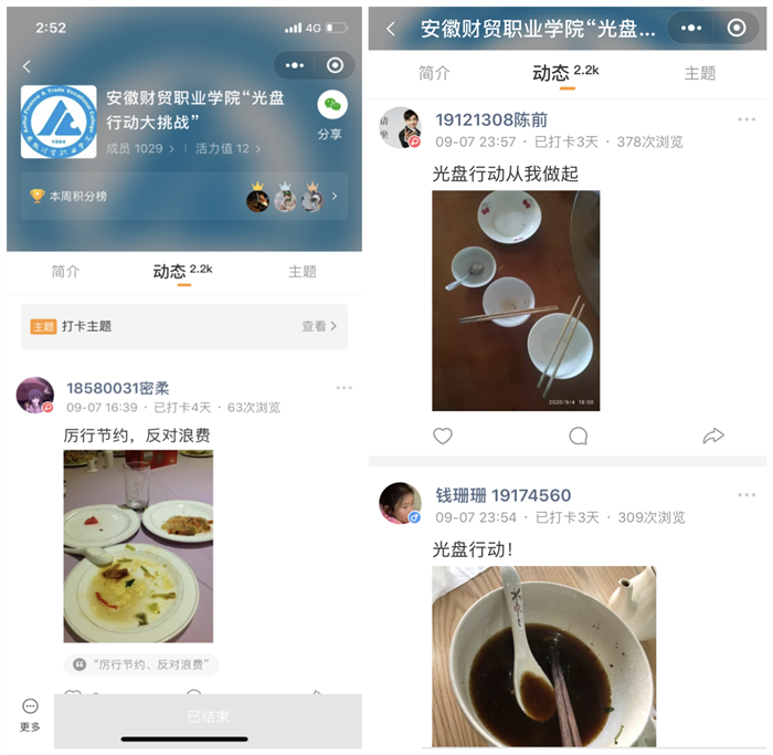 举办“光盘行动大挑战”线上接力活动。学校团委学生会通过微信“小打卡”程序,在全校范围内开展“光盘行动大挑战”活动,由学生自发拍摄在家中或者在餐厅就餐后的光盘照片,上传到安徽财贸职业学院“光盘行动大挑战”打卡圈子,参与光盘挑战,以轻松娱乐方式带头强化节俭自律意识,倡导合理消费,培养学生勤俭节约的良好美德。截止目前,累计参与挑战学生人数达2200人次。