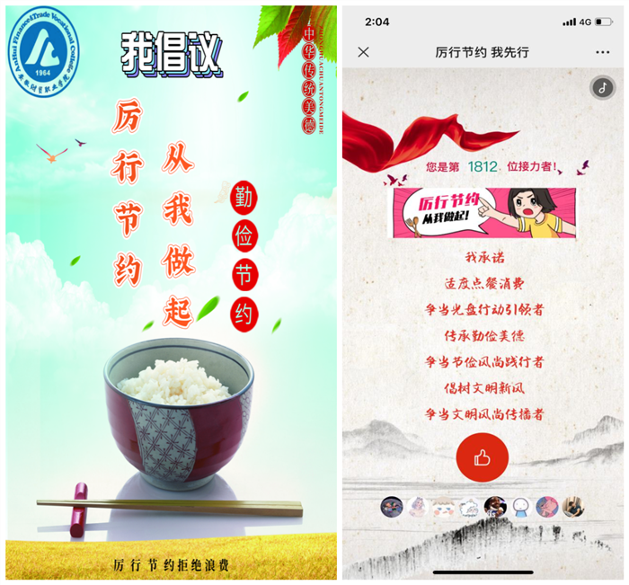 为深入学习贯彻习近平总书记关于制止餐饮浪费作出的重要指示精神,大力弘扬中华民族勤俭节约的优良传统,在学生群体中牢固树立节约光荣、浪费可耻的思想观念,近期,学院团委充分利用网络团支部、微信公众号、腾讯会议等新媒体平台,开展以“厉行节约,反对浪费”为主题教育活动,使得厉行节约、反对浪费在校园内蔚然成风。