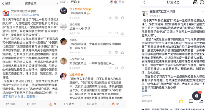 3月9日下午,宾虹艺术学院组织全体学生利用电脑、手机等设备,通过人民网、人民智云客户端、咪咕视频客户端等网络平台在线观看了“全国大学生同上一堂疫情防控思政大课”直播。四位主讲专家结合当前防疫中的案例,从不同的角度出发给同学们上了一堂生动的爱国主义教育思政课。观看疫情防控思政大课后,各班级通过班级QQ群、微信群、钉钉群、微博等网络平台开展了形式多样的学习心得交流活动,共计398名学生参与此次活动。