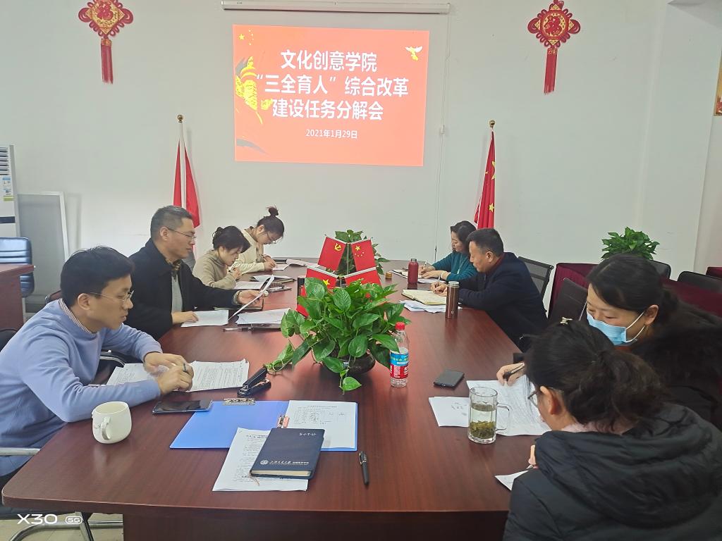 1月29日下午,文化创意学院在综合楼210召开“三全育人”综合改革建设任务分解会。党总支书记张克、院长郭湘如、副书记宋凌云、副院长高静出席会议,全体行政人员参加会议。