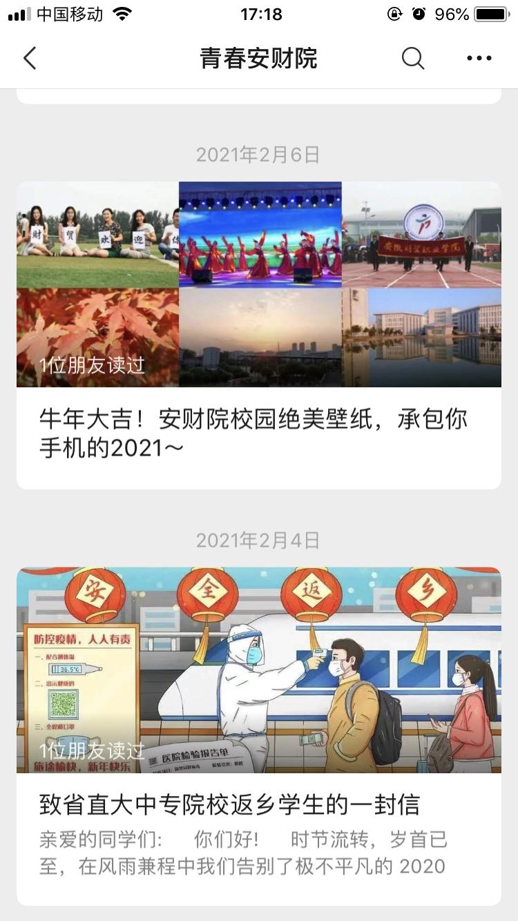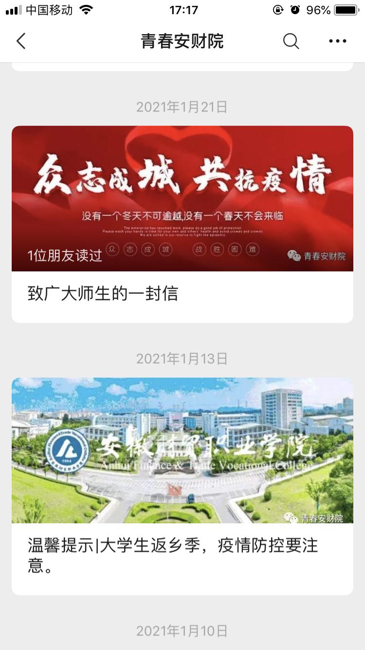 微信公众号“青春安财院”推出《致广大师生的一封信》,提醒同学们假期居家仍要筑牢疫情防控的警惕线,严格落实防控要求,做好自我和家人安全防护;同时,公众号通过发布《安财院寒假清单》鼓励同学们假期仍要合理利用时间,科学安排假期学习计划,做到不负韶华,奋力进取。