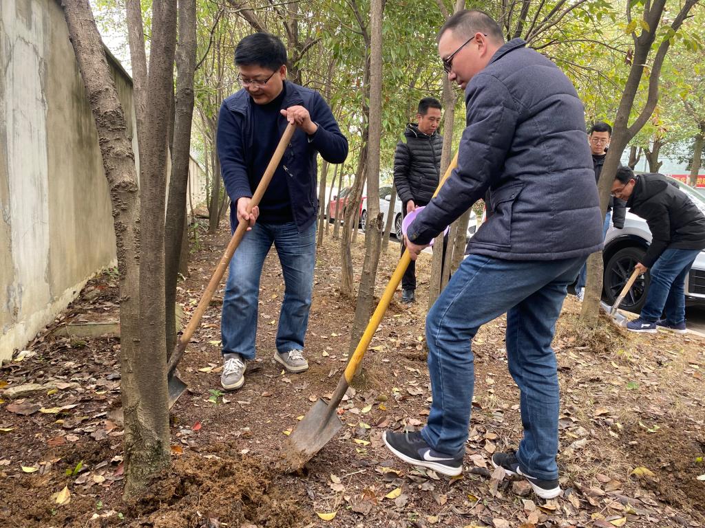 在植树点,大家手持铁锨,干劲十足地为一棵棵充满生机与希望的树木翻土,党员同志们相互帮助提桶、打水、挖坑、翻土、施肥,干得好不热闹,很快便完成了树木的保养、绿化工作。