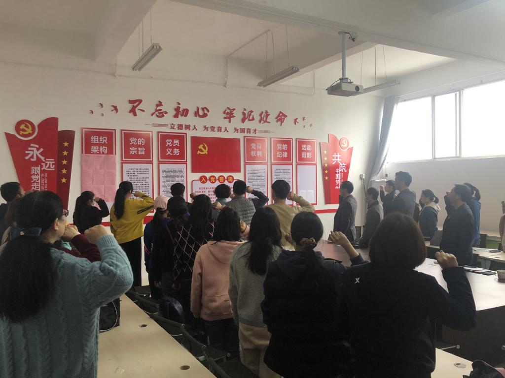 在党员活动室内,4月过政治生日的党员教师黄洁、张月娥、胡靖、郭成成互相佩戴党员徽章,黄洁带领全体党员教师重温入党誓词,大家一同学习了《论中国共产党历史》《中国共产党章程》《关于新形势下党内政治生活的若干准则》部分章节。