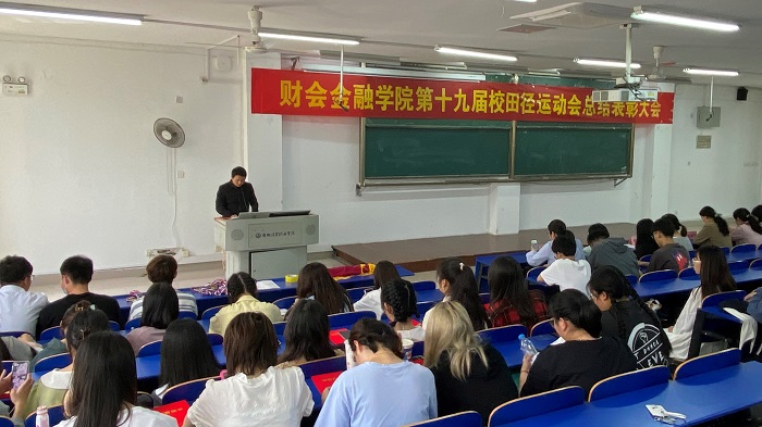 4月29日中午,财会金融学院第十九届校田径运动会总结表彰大会在6103教室召开,党总支副书记李健、团总支书记沈丽萍及全体专职辅导员出席本次会议,全体运动员及运动会工作人员参会。