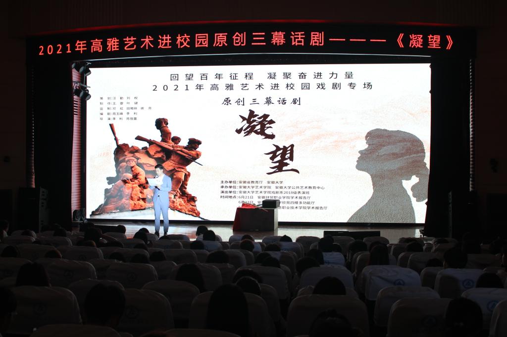 6月21日晚,由安徽省教育厅、安徽大学主办的“2021年高雅艺术进校园——原创三幕话剧《凝望》”演出活动在学校学术报告厅隆重举行,学生处、团委、二级院部团总支负责人与现场300余学生共同观看了演出。
