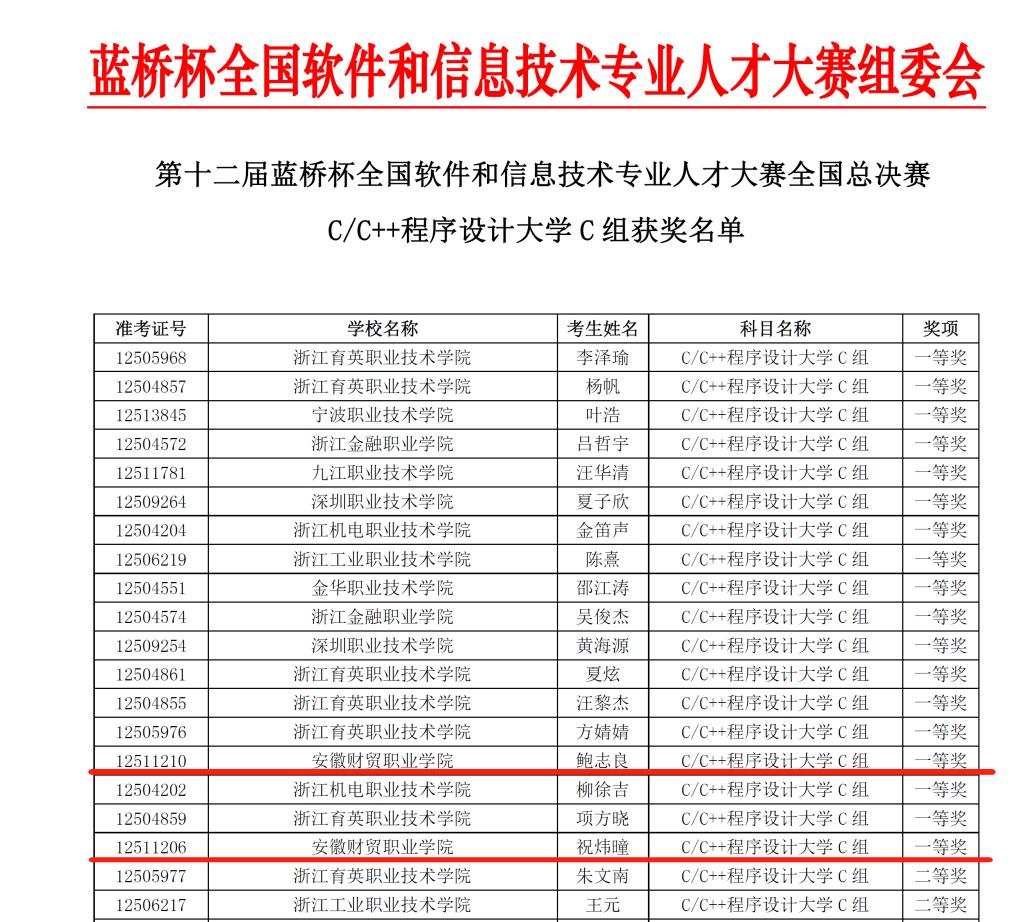 6月8日,第十二届“蓝桥杯”全国软件和信息技术专业人才大赛(以下简称“蓝桥杯”全国大赛)全国总决赛结果揭晓。我校信息工程学院计算机应用专业1901班鲍志良和信息技术专业1802班祝伟曈两位同学均获得一等奖的优异成绩,再创辉煌!