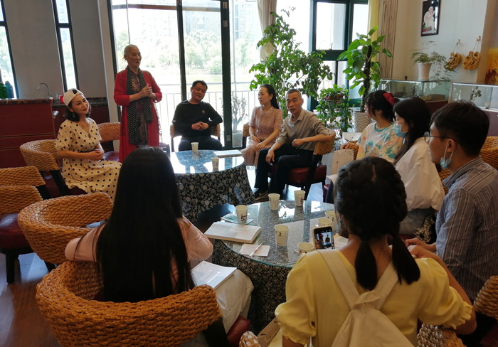 当天下午,师生一行来到了位于太平府文化园的“当涂民歌传习所”,在这里,当涂民歌唯一国家级传承人陶小妹和大家围坐在一起,就当涂民歌的历史发展和传承现状进行交流。
