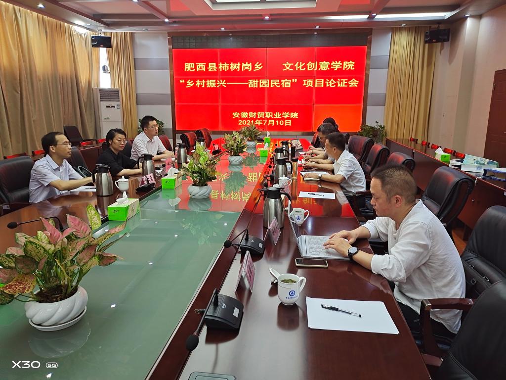 7月10日上午,肥西县柿树岗乡党委书记何欣欣、乡长汪胜杰、副书记侯文蕾率队来我院就“乡村振兴”校地合作“甜园民宿”项目进行洽谈。文化创意学院党总支书记张克、院长郭湘如、办公室主任王帮红、教研室副主任应莉参会,本次会议邀请了经济贸易学院教研室主任许明星参会。