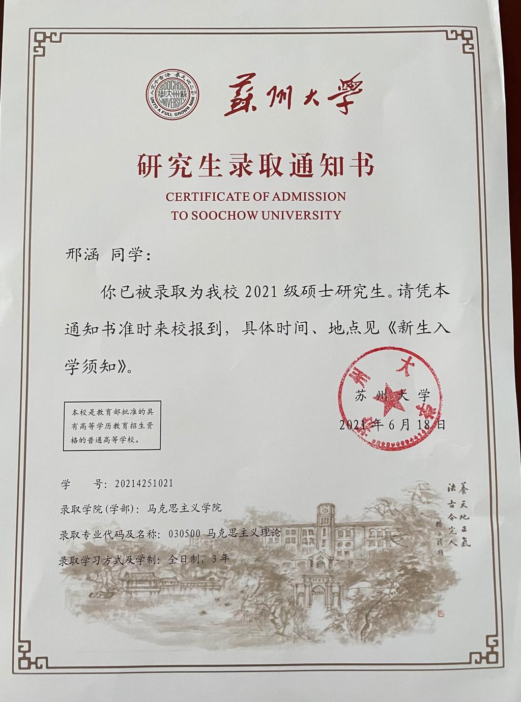 有了本科的平台、对自我更高的要求,以及清晰的自我规划后,她选择考研。人生的意义,就是在于不断挑战自己,爬向风景更为开阔的山峰。因为目标明确,所以脚步坚定,经过十个月的艰苦蛰伏,她成功被苏州大学录取。
