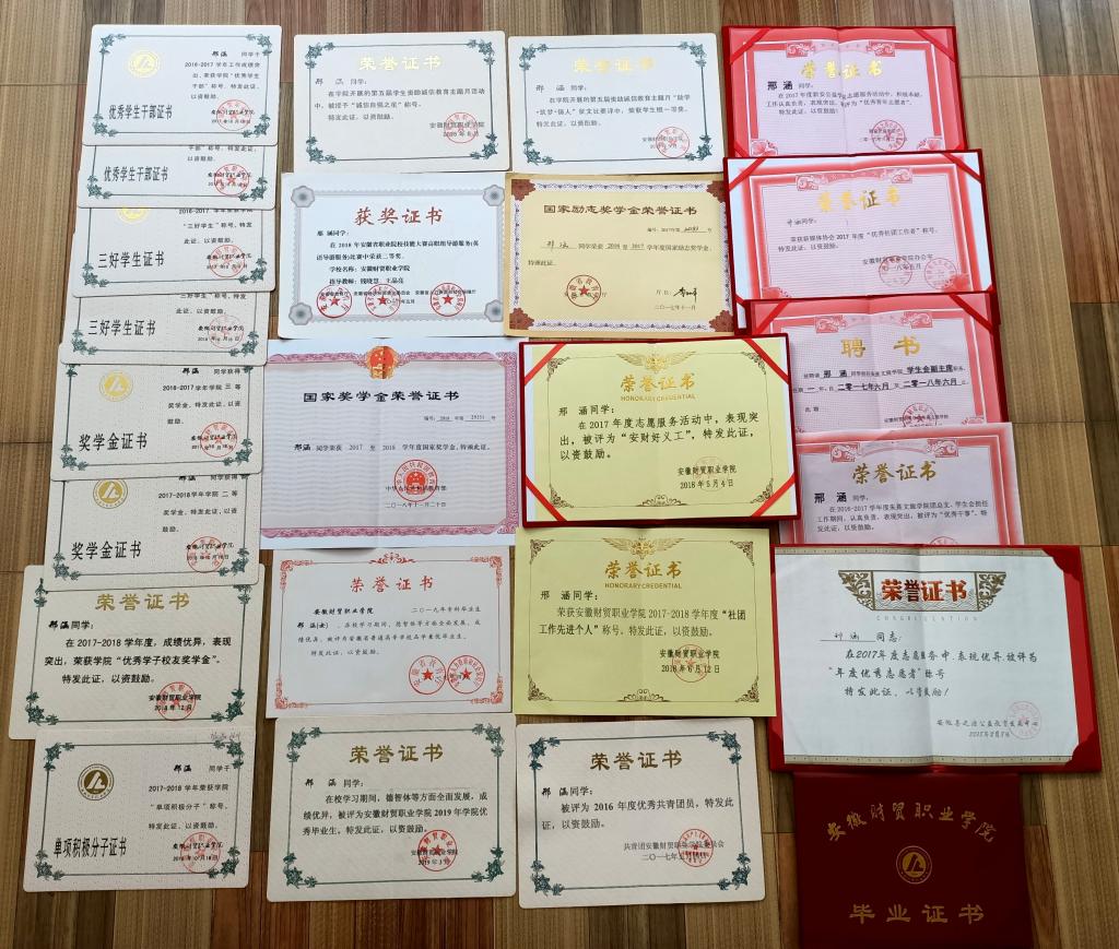 邢涵同学笑着说:“我在高中学习并不刻苦,加上偏科,所以成绩一般。当时选择分类招生考上财贸非常欣喜,现在想想,这真是我近几年做过最正确的选择,蜕变的开始。”2016年9月,十七岁的邢涵开启了她的财贸学习时光。她表示,刚开学也非常迷茫,点醒她的是学院举行的表彰大会,在听了优秀学长学姐的获奖经历后倍有感触,并开始以他们为榜样,严格要求自己。第一学年她凭借综合排名第一的成绩拿到第一笔奖学金。第二学年,由于踏实稳重的性格、担任班长期间任劳任怨的工作态度,成功当选为学院学生会副主席。个人能力得到锻炼的同时,学习上也没有疏忽,以优异成绩获得国家奖学金、校级二等奖学金、优秀学子校友奖学金等荣誉。在财贸的两学年共获奖学金近两万元、获得多项荣誉称号,大三学年被评为2019届安徽省双优生、安徽财贸职业学院双优生。