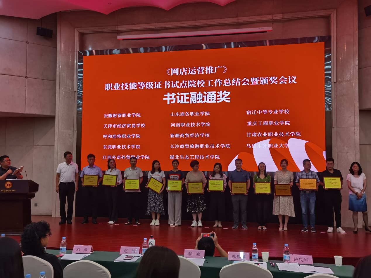 自国务院“职教二十条”发布以来,我校积极研究政策,制定了《安徽财贸职业学院“1+X”证书培训与考核管理办法(试行)》,在制定人才培养方案时主动融入核心技能发散到核心专业课当中,强力保障了“1+X”证书制度的常态化运行与持续发展。鉴于我校在试点推进以来对“1+X”网店运营推广职业技能等级证书试点工作的支持与帮助,在试点工作中统筹安排教学活动与内容,推进证书培训与专业教学过程一体化,推进证书试点工作稳步进行,为其它院校提供了示范与样板,在此次全国职业院校评选中被评为“书证融通奖”,经济贸易学院副院长江友农代表学校上台领奖。