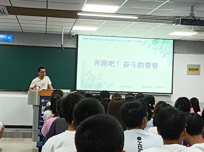 徐新寿以“奔跑吧,奋斗的青春”为题,从专业介绍、就业分析和成长规划三个方面,勉励新生要夯实基础、重视专业知识学习,他还通过短小精炼的视频案例,介绍大数据技术在财政资金审计和税务审计等方面发挥的重要作用,加深学生对审计学习的兴趣。