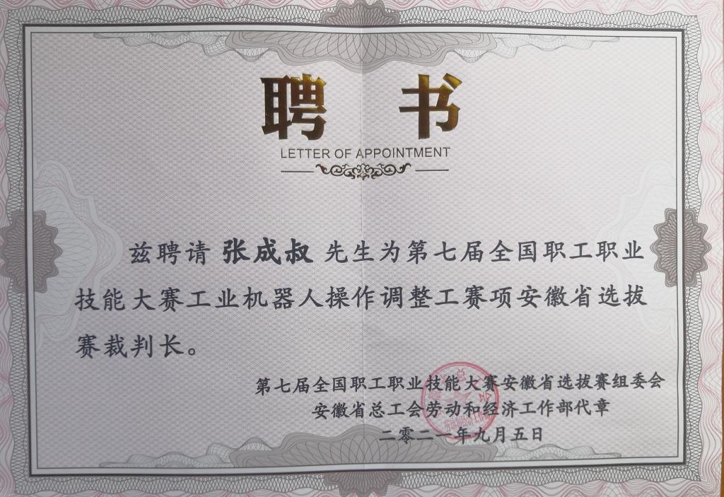 2021年9月16至18日,第七届全国职工职业技能大赛——工业机器人操作调整工安徽省选拔赛在省会合肥举行,我校信息工程学院院长张成叔受邀担任本次大赛的裁判长。