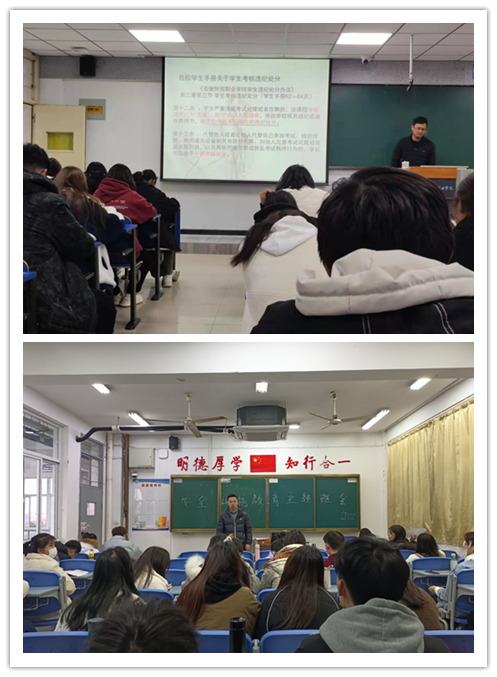 在班会中,辅导员从“考试诚信与遵纪守法”的角度,真正引导学生“守法律,讲诚信”。考试作弊不仅会践踏诚信理念,加剧信用危机,也会助长部分学生不劳而获、投机取巧的心理,干扰良好学风的形成,严重阻碍个人的健康发展。对于即将到来的期末考试,各班签订了诚信考试承诺书,并进行了诚信宣誓。