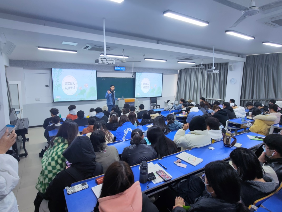 专职辅导员老师陈亮对所带班级召开以“诚信做人,诚信考试”为主题的班会,使学生充分认识到诚信考试的重要意义。让学生真正明确树道德之新风,立诚信之根本,营造“诚信考试光荣,违反作弊可耻”的考试氛围,维护知识的尊严,营造公平、公正考试环境,是当代大学生义不容辞的责任。