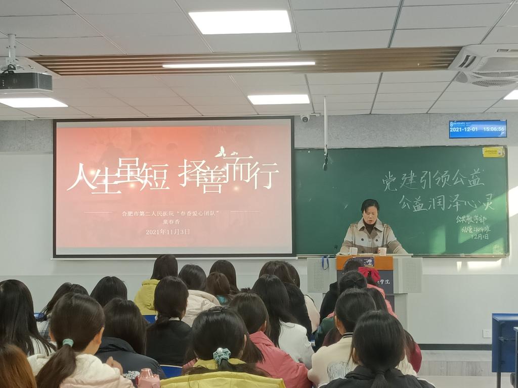 为充分发挥道德楷模的示范引领作用,大力弘扬中华民族优秀文化,教育引导广大学生修身立德、刻苦学习,在国际志愿者日来临之际,12月1日下午,由合肥市文明办和公共教学部联合选拔的安徽财贸职业学院公共教学部校外德育辅导员童春香走入幼管2101班,开展了以“党建育人 润泽心灵”为主题的特殊班会。