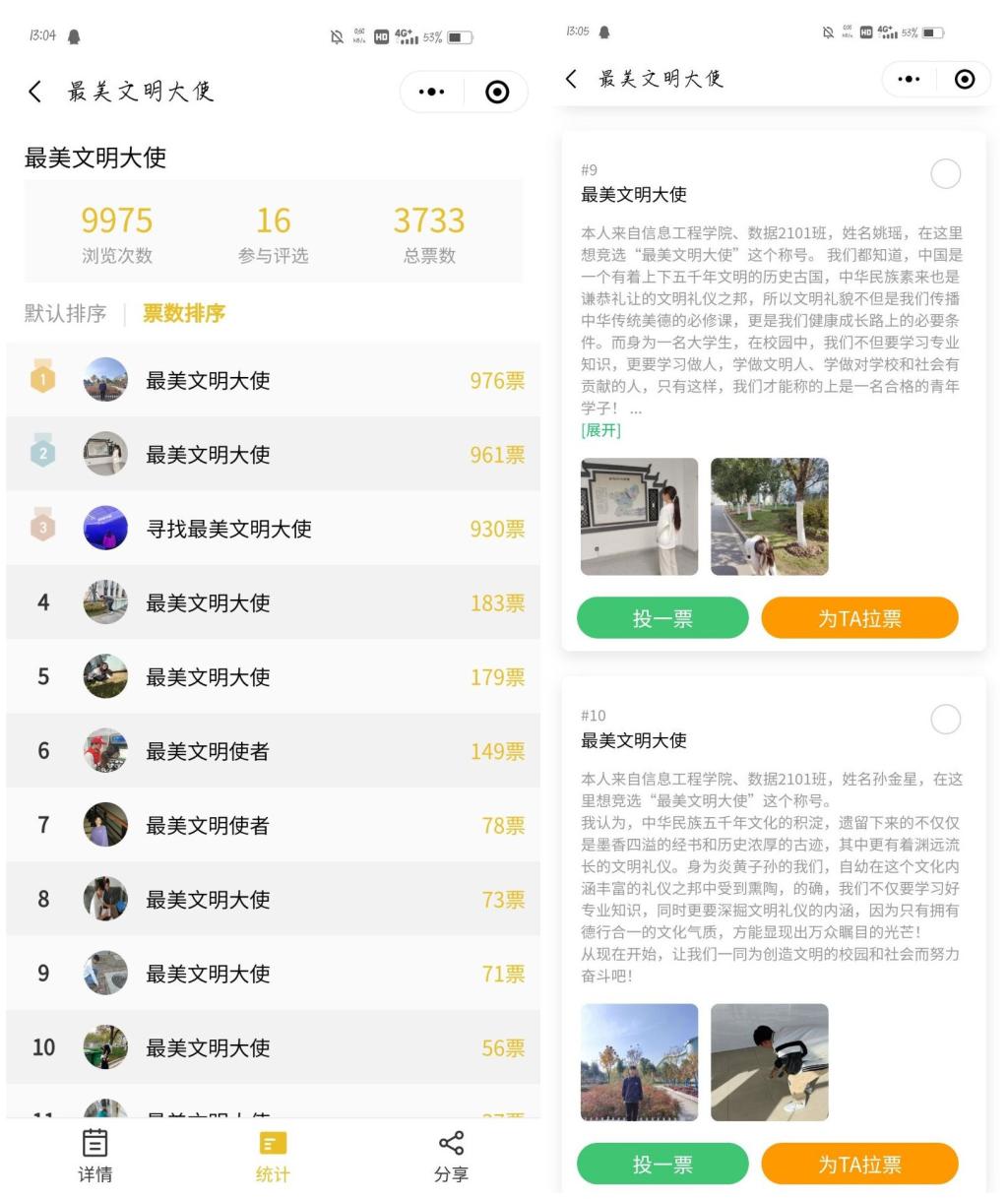 活动主要围绕“厚德端行知荣辱,文明修身树新风”的主题开展,于11月19日启动,历时一周。参评同学将自己的文明形象和自我事迹简介上传到微信小程序参评,根据获得支持票数的多少评选出“最美文明大使“男女生各一名。共有21名同学参与活动,最终数据2101班姚瑶和孙金星两位同学获得“最美文明大使”称号。