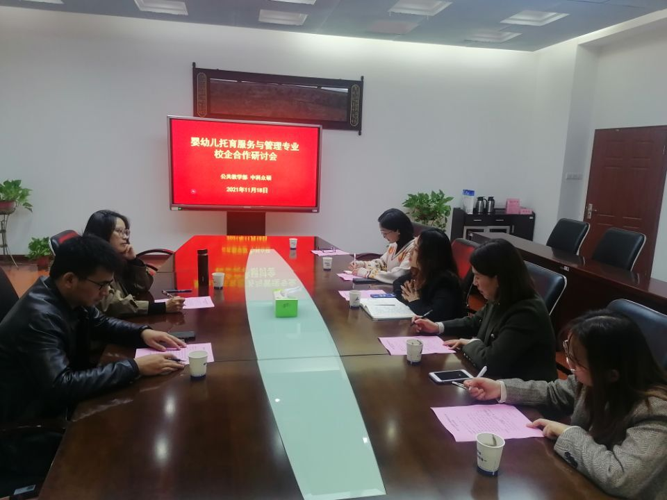 为积极促进婴幼儿托育服务与管理专业校企合作的深入开展,11月18日下午,公共教学部在行政楼第三会议室召开校企合作研讨会,会议由公共教学部副主任陈伟主持。安徽中科众硕教育科技有限公司董事长胡彩红、总经理朱小斌,公共教学部办公室主任杨志祥、人文教研室主任赵倩、幼管专业负责人王潇和幼管专业课教师胡利繁出席了会议。