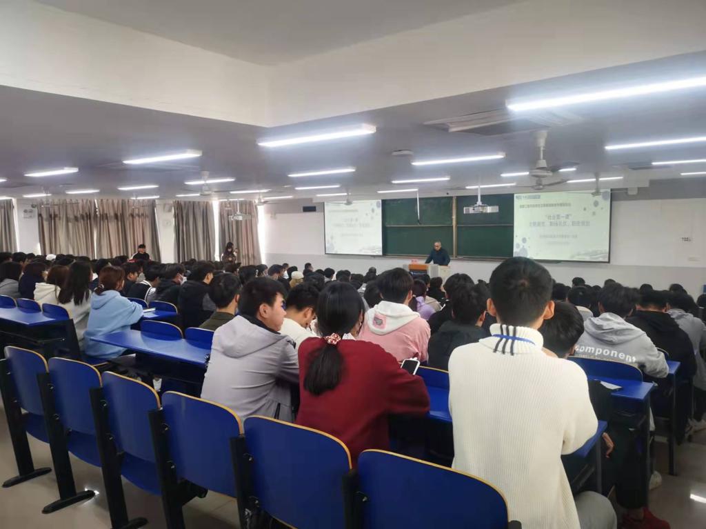 以“社会第一课”为切入点,从文明规范、职场礼仪和职业规划三个方面展开。闻涛作为“社会第一课”的主讲人,用生动的案例和风趣的语言,从工作、学习、自我成长到树立目标再到如何提升技能等几个维度来讲述,鼓励同学们要端正心态、做足准备,才能在激流中迅速转变角色,融入工作。同学们表示在轻松愉悦的氛围中了解了职场,获得了知识,增长了见识。储继鹏亲切的分享了自身的奋斗历程,交流了个人成长的经验体会。互动环节中,同学们踊跃提问,闻涛和储继鹏先生都耐心、细致又不失风趣的进行了解答,赢得现场阵阵掌声。
