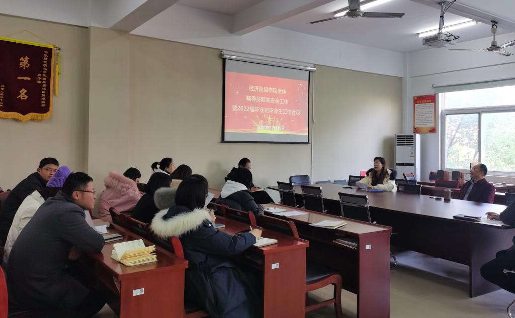 12月29日,经济贸易学院在综合楼212办公室召开全体辅导员期末安全会议暨2022届毕业班毕业生工作会议,会议由党总支副书记丁蓉主持,全体辅导员参会。