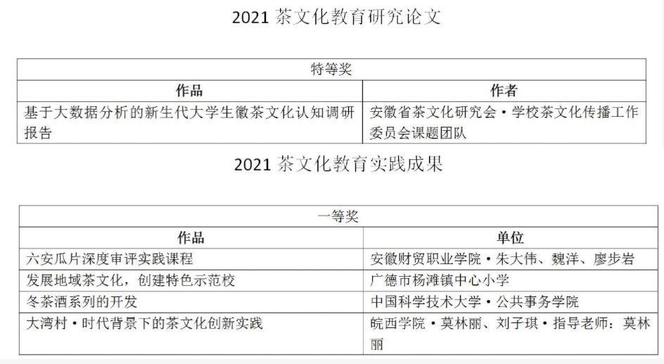 在随后举行的安徽省茶文化研究会2021年茶文化教育论坛活动中,我院茶旅教研室推送的《六安瓜片深度审评实践课程》获茶文化教育实践成果一等奖。茶旅教研室武咸春老师参与的《基于大数据分析的新生代大学生徽茶文化认知调研报告》获得2021茶文化教育研究论文特等奖。