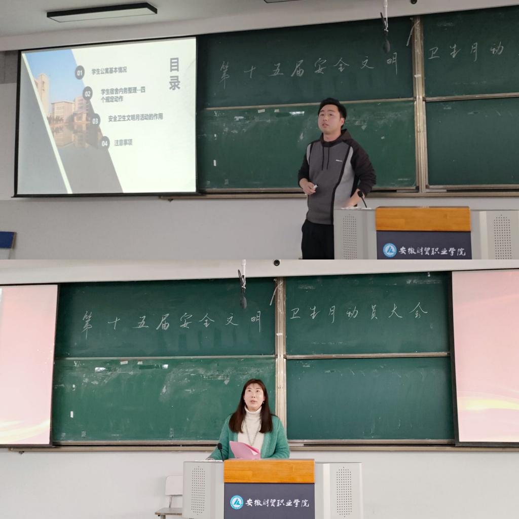 大会伊始,张超宣读了学校安全卫生月的相关文件,强调了标兵宿舍和优胜班级的评选条件,在确保安全的前提下,努力提高生活环境质量,各寝室成员需按照“四个规范动作”对寝室卫生进行整改,专兼职辅导员需深入学生宿舍检查,保证班级学生宿舍“6s”认证通过率提升至100%。