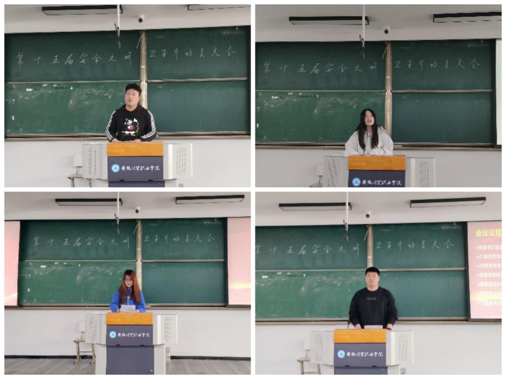 21级优秀宿舍代表姚旭同学和20级优秀宿舍代表丁春燕分别发言,提出宿舍是每个大学生在大学里的“家”,寝室也是学习和生活的重要场所,寝室安全更是学校安全的重要组成部门,并以自身寝室为例倡导宣传共建安全文明校园。优胜班级代表胡正峰同学对优秀班级宿舍情况做了简单介绍,他认为干净整洁、健康向上的寝室文化对寝室成员至关重要,应推动形成学生干部带头作用的良好风气,落实寝室长负责制度。宿管部部长柳玉婷宣读了经济贸易学院学生会对宿舍卫生检查的自我管理细则,强调使用违规电器带来的安全隐患问题,提出要加强宿舍用电防范意识,提高学生自律意识,团结宿舍成员,营造安全文明的宿舍环境。