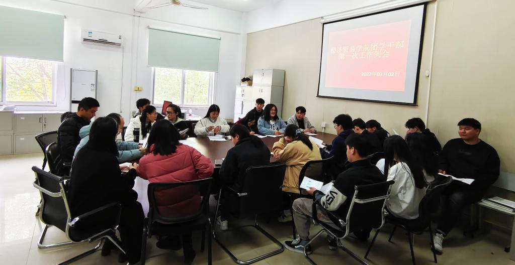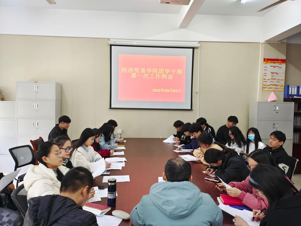 3月2日,经济贸易学院团总支、学生会在综合楼211办公室进行新学期工作汇报,经济贸易学院团学组织下属秘书部、组织部、实践部等12个部门部长全员到齐,经济贸易学院团总支书记张超,专职辅导员占陈芳、沈梦玲、徐浩到会指导工作。