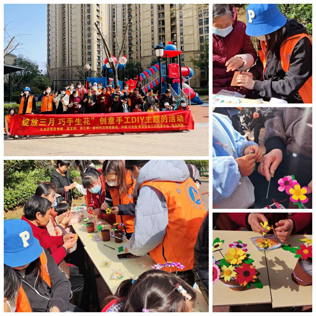 3月8日,在“三八”国际妇女节之际,经济贸易学院实践部的志愿者们参与芙蓉社区九龙居民区党委、新时代文明实践站、关工委、团支部、妇联计生协工会合肥经济技术开发区青云社会工作服务中心组织的创意手工活动。社区里的妇女同志们纷纷积极参与到活动中,志愿者在一旁热心地指导。在大家的努力下,一盆盆五彩缤纷的手工花朵在阳光下鲜艳夺目,构成了一幅欣欣向荣的画面。
