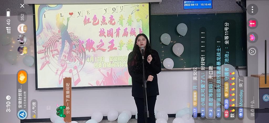 4月13日下午,由校团委举办的“红色点亮青春”校园云K歌大赛决赛在“安徽财贸职业学院团委”抖音平台上圆满结束。