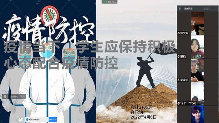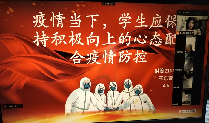 4月6日晚,财会金融学院开展“疫情当下,学生应保持积极向上的心态配合疫情防控”主题线上口训,提高学生防疫意识,引导学生以积极的心态做好疫情防控。