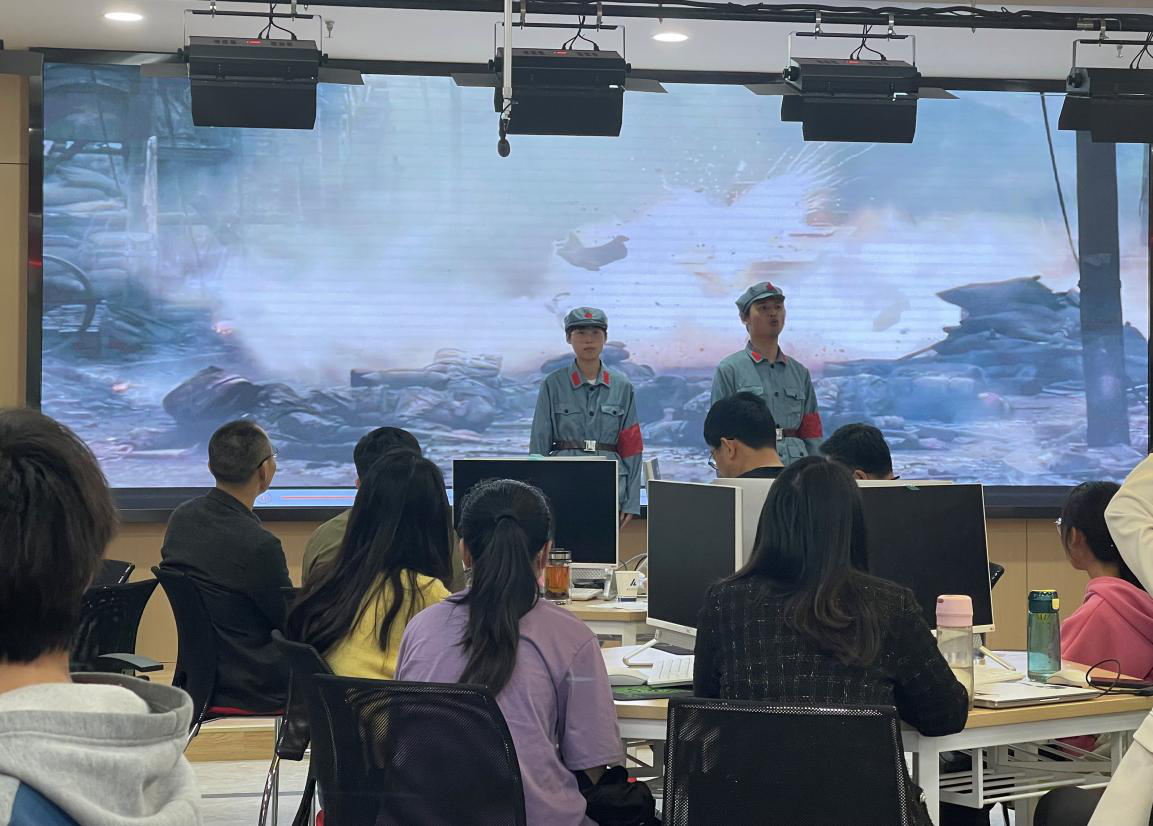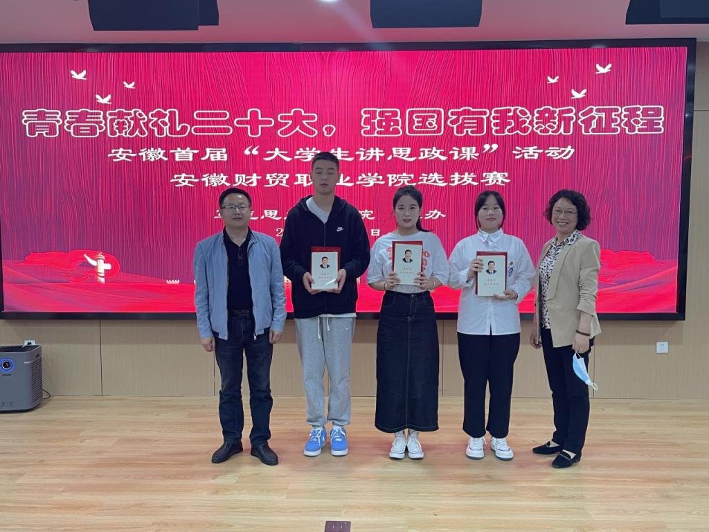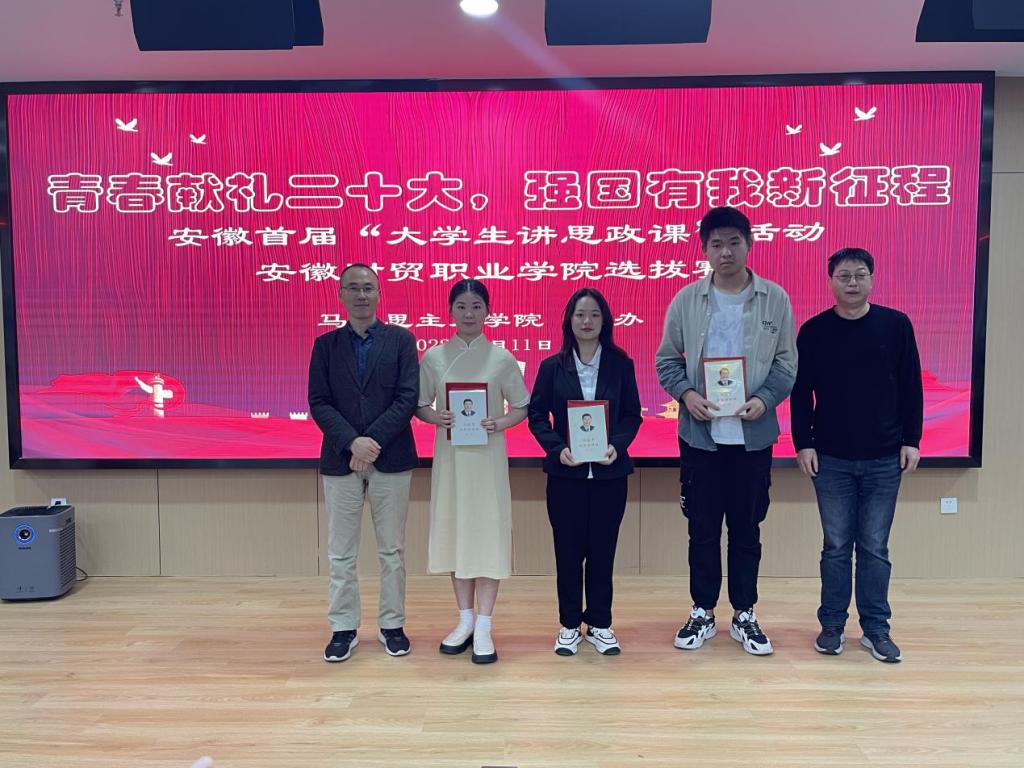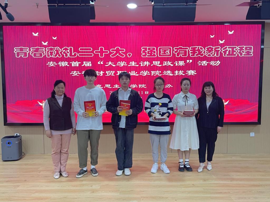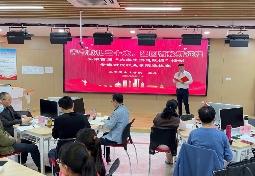 5月11日,安徽省首届“大学生讲思政课”活动安徽财贸职业学院选拔赛在实训楼思政智慧实训教室举行。来自学校5个院(部)的13个代表团队参加了本次比赛。办公室主任席曦,监察审计处处长王良斌,教务处副处长房丙午,马克思主义学院副院长张少兵、崔学明及专任教师徐明教授、徐莲教授、谢征宇副教授担任评委并为获奖选手颁奖。比赛由马克思主义学院专任教师孙中天主持,全体专职教师观看了比赛。