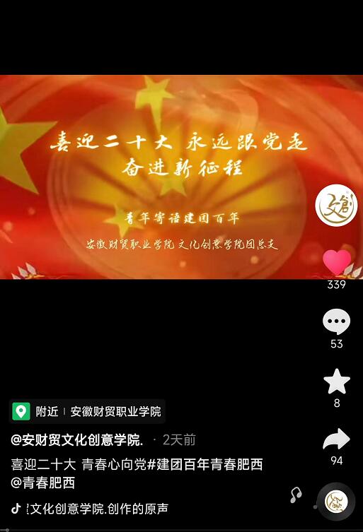 5月3日,由共青团肥西县委员会、安徽财贸职业学院团委及多家高校联合主办的2022年肥西县五四青年短视频征集大赛结果公布,我校文化创意学院团总支提交的宣传片荣获三等奖。